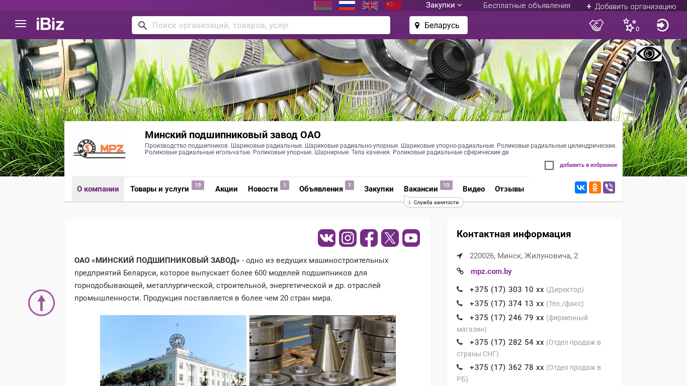 Название / Заголовок | Минский подшипниковый завод ОАО - Производство подшипников. Шариковые радиальные. Шариковые радиально-упорные. Шариковые упорно-радиальные. Роликовые радиальные цилиндрические. Роликовые радиальные игольчатые. Роликовые упорные. Шарнирные. Тела качения. Роликовые радиальные сферические дв. 220026, Минск, , Жилуновича, 2 |