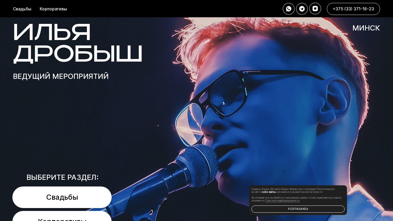 Ключевые словаИлья Дробыш ведущий ведущий Минск ведущий мероприятий Минск ведущий на свадьбу Минск ведущий на корпоратив Минск ведущий на юбилей Минск ведущий на выпускной Минск тамада Минск