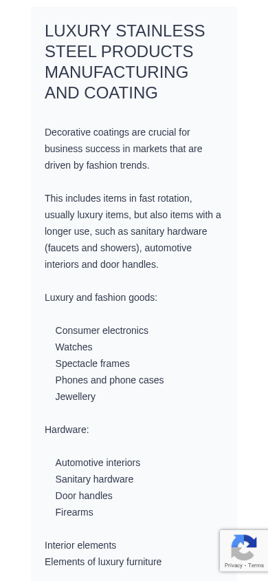 SEO-описание | Decorative coatings are crucial for business success in markets that are driven by fashion trends. This includes items in fast rotation, usually luxury items, but also items with a longer use, such as sanitary hardware (faucets and showers), automotive interiors and door handles. Luxury and fashion goods: Consumer electronics Watches Spectacle frames Phones and phone cases Jewellery Hardware: Automotive interiors Sanitary hardware Door handles Firearms Interior elements Elements of luxury furniture |
