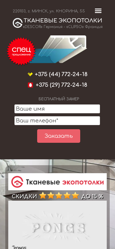 | SEO-описание | Тканевые натяжные потолки CLIPSO (Клипсо) и DESCOR (Дескор) в Минске. Монтаж, установка натяжных потолков. Реализация потолочно-стеновых систем и комплектующих. |