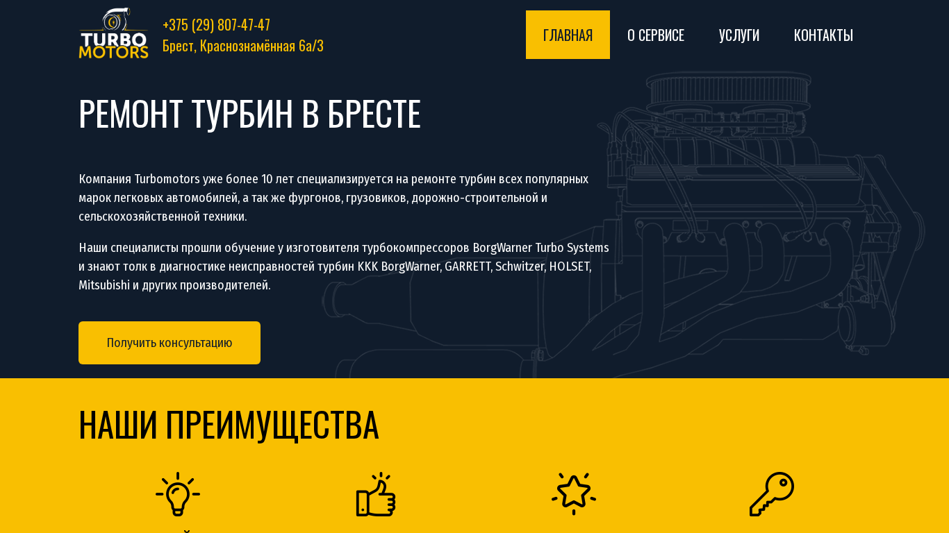 SEO-описание | Автосервис Турбомоторс производит диагностику и ремонт турбин в Бресте на европейском оборудований. Ремонт актуаторов. Гарантия, качество, недорого. |