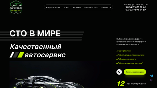 SEO-описаниеᐈ ⭐ СТО в Мир 🔥 Все виды ремонта 🔥 Помощь на дороге ⚡ диагностика и ремонт подвески ⚡ компьютерная диагностика ⚡ ремонт двигателя ⚡ ремонт кпп ⚡ автоэлектрик ➤➤➤ Гарантия 100% на все услуги. ☎️ (29) 327-79-15 ⭐ Автомастерская ⭐ 12 лет опыта ✓ Запишитесь на ремонт уже сегодня!