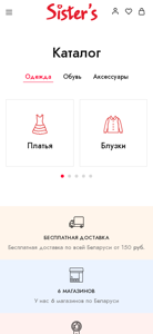 | AI-анализ | The web project "Sister's" is an online clothing, shoe, bag, and accessory store. The business has a presence in six retail centers across Belarus, including locations in Minsk and Grodno. The phone number for customer inquiries is +375 (29) 161-20-20. The store offers free shipping with a minimum purchase of 150 rubles. Sister's has been in business for over 10 years and has six physical locations in Belarus. The website features a variety of women's clothing, such as dresses, blouses, jeans, and sportswear. There are also sections for shoes, bags, and accessories. The site offers a wishlist function and allows users to add items to their cart. The catalog includes new arrivals and items on sale. Some reviews from customers express satisfaction with the store |