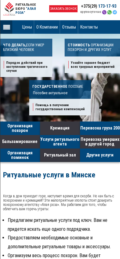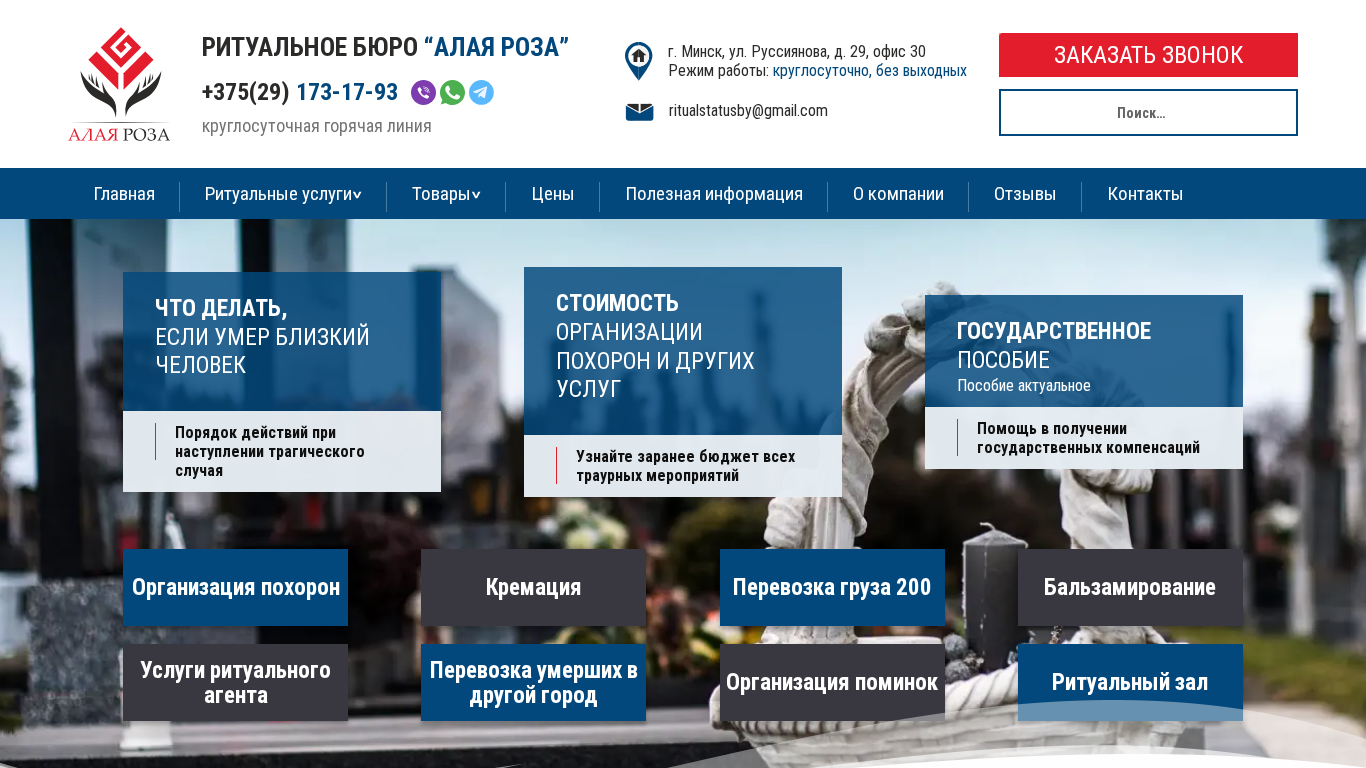 SEO-описание | Заказать ритуальные услуги в похоронном бюро «Алая роза» в Минске и Минском р-не ⭐ Более 5 лет организуем похороны по государственным ценам ⭐ Круглосуточный вызов агента по телефону +375 (29) 173-17-93 ☎️ |