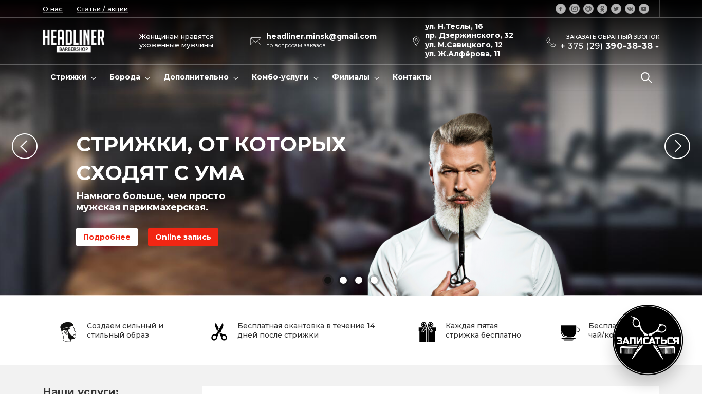 SEO-описание | Барбершоп Headliner (Хедлайнер) салон мужской стрижки предлагает услуги мужской стрижки и стрижки бороды в Минске по приемлемым ценам. Мужская стрижка от 30 рублей. Стрижка бороды от 20 рублей. Барбершоп Грушевка. Барбершоп Минск Мир |