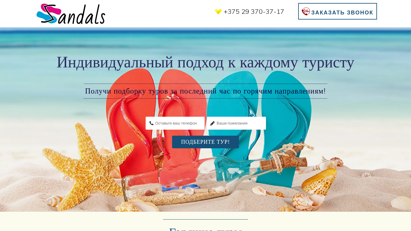 The web project Sandals.by functions as a travel guide in the world of journeys. Users can contact the website via two phone numbers to make a call and inquire about individual tours. The site offers an individual approach to each tourist and provides a selection of tours based on the latest trends in popular destinations. Hot tours include Egypt, India, Thailand, the UAE, Sri Lanka, Vietnam, Turkey, Greece, Montenegro, Cuba, the Dominican Republic, Bulgaria, Spain, Cyprus, the Maldives, and more. Each tour includes round-trip airfare, accommodation and meals, airport transfer with a Russian-speaking guide, and travel insurance as a gift. Sandals.by works directly with 75 tour operators to ensure the best prices for customers. The office is located in Minsk, Belarus, and is open daily from 10:00