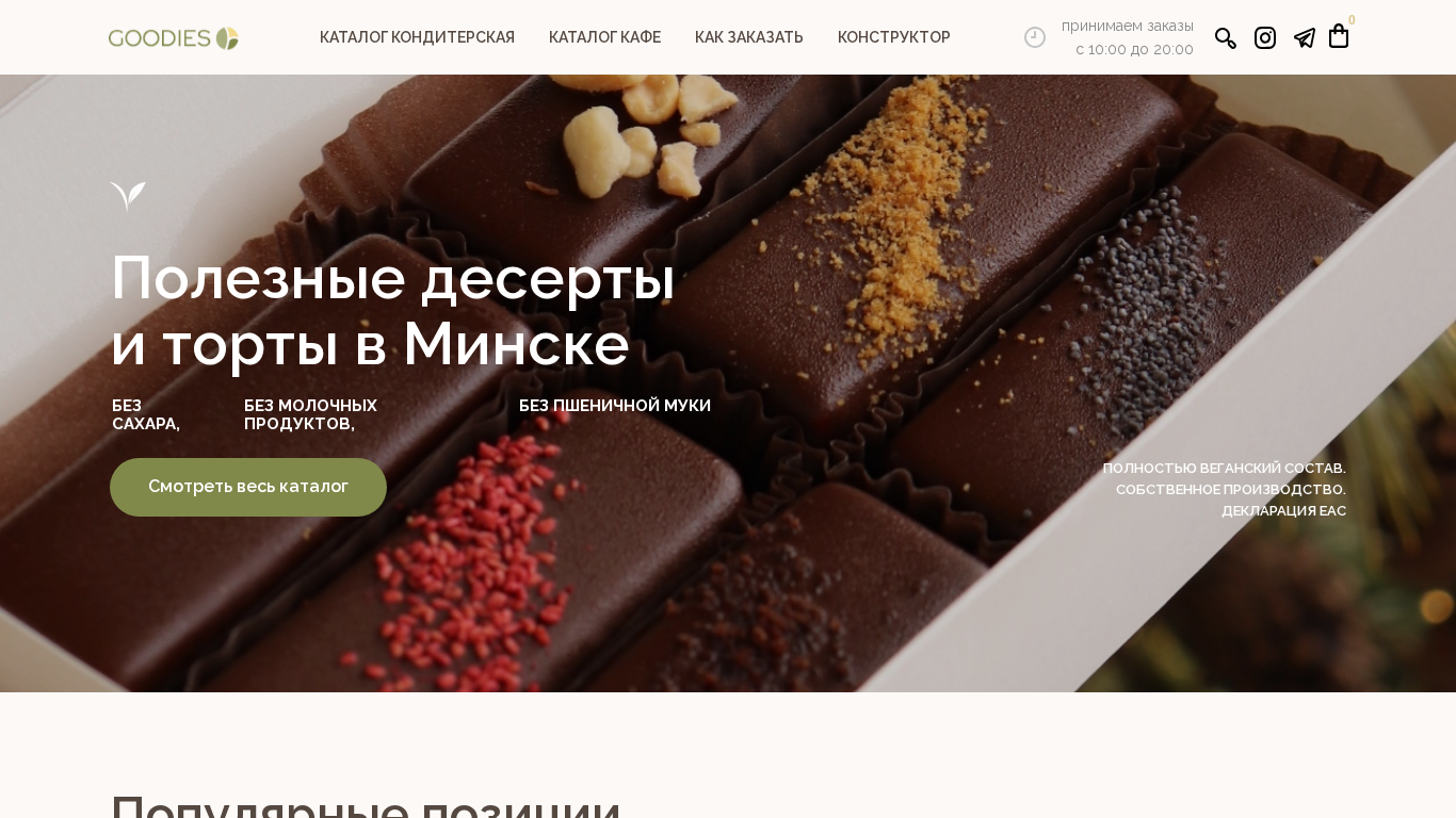 SEO-описание | Полезные веган десерты и торты Goodies в Минске. Доставка, самовывоз. Без сахара, пшеничной муки и молочных продуктов. |