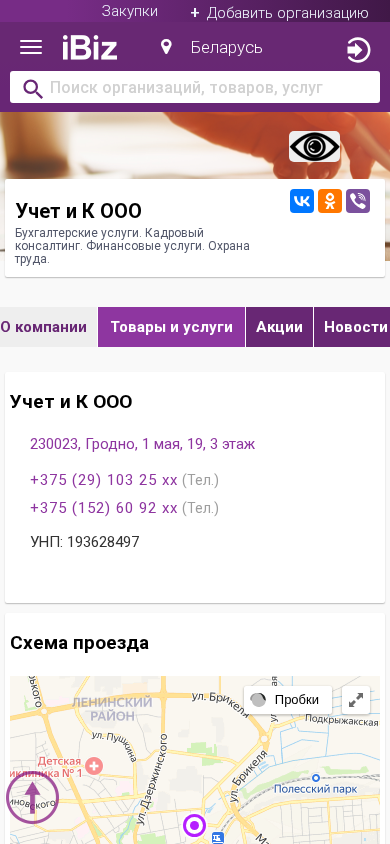 Название / Заголовок | Учет и К ООО - Бухгалтерские услуги. Кадровый консалтинг. Финансовые услуги. Охрана труда.. 230023, Гродно, , 1 мая, 19, 3 этаж |