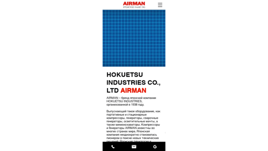 SEO-описание | AIRMAN – бренд японской компании HOKUETSU INDUSTRIES, выпускающей профессиональное промышленное оборудование, не имеющее аналогов в мире. Промышленные винтовые компрессоры и генераторы, мини экскаваторы и ножничные подъёмники AIRMAN известны во многих странах мира. Исключительно Японские технологии и качество! |