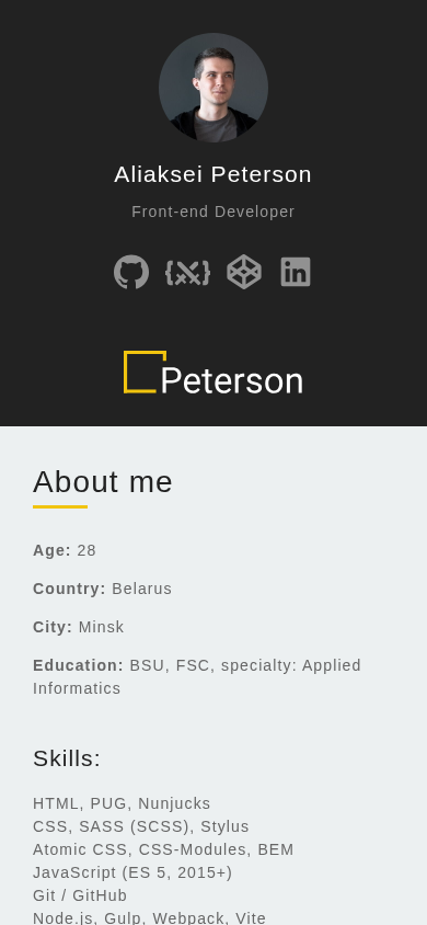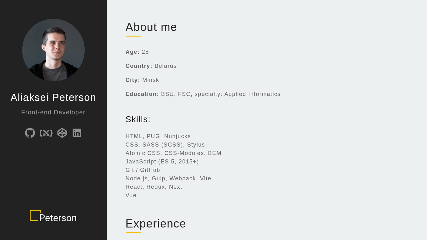 Название / Заголовок | Aliaksei Peterson | Front-end developer |