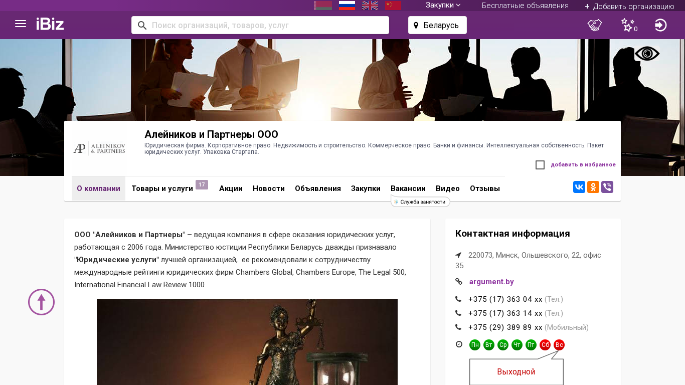 Название / Заголовок | Алейников и Партнеры ООО - Юридическая фирма. Корпоративное право. Недвижимость и строительство. Коммерческое право. Банки и финансы. Интеллектуальная собственность. Пакет юридических услуг. Упаковка Стартапа.. 220073, Минск, , Ольшевского, 22, офис 35 |