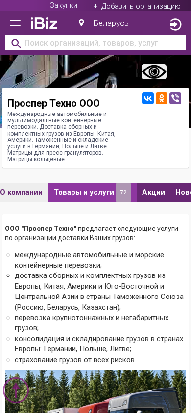 Название / ЗаголовокПроспер Техно ООО - Международные автомобильные и мультимодальные контейнерные перевозки. Доставка сборных и комплектных грузов из Европы, Китая, Америки. Таможенные и складские услуги в Германии, Польше и Литве. Матрицы для пресс-грануляторов. Матрицы кольцевые. . 220007, Минск, , Воронянского, 50/5 - 302