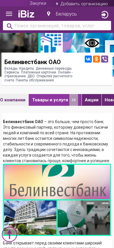 Название / Заголовок | Белинвестбанк ОАО - Вклады. Кредиты. Денежные переводы. Сервисы. Платежные карточки. Онлайн - страхование. ДБО. Открытие расчетного счета. Пакеты обслуживания.. 220002, Минск, , Машерова пр-т, 29 |