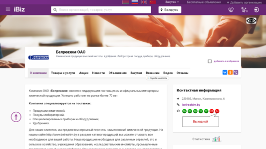 Название / Заголовок | Белреахим ОАО - Химическая продукция высокой чистоты. Удобрения. Лабораторная посуда, приборы, оборудование.. 220103, Минск, , Калиновского, 6 |