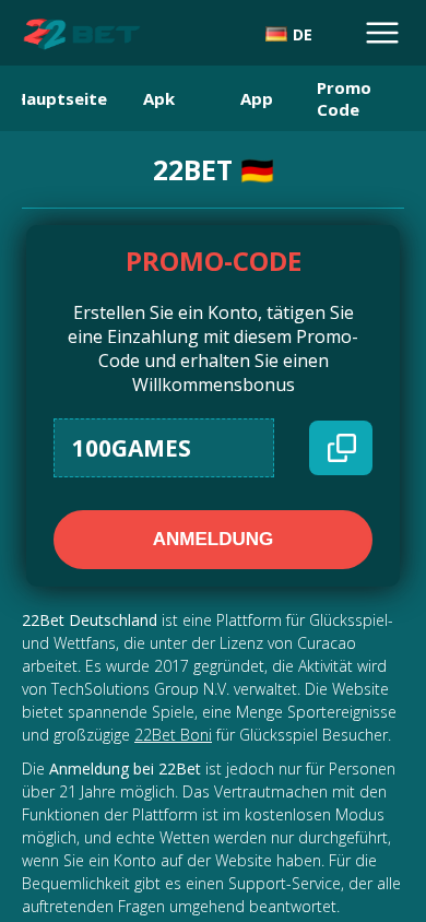 SEO-описание | 22Bet ist Ihr ultimatives Ziel für Online-Glücksspiele und Sportwetten! ✔️ Genießen Sie sicheres und faires Spielen mit 22Bet Boni |