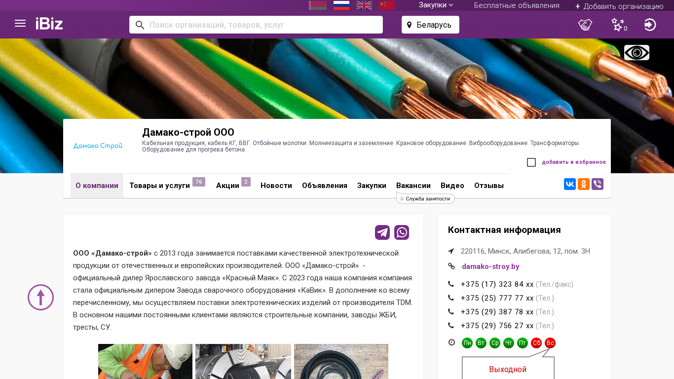 Название / Заголовок | Дамако-строй ООО - Кабельная продукция, кабель КГ, ВВГ. Отбойные молотки. Молниезащита и заземление. Крановое оборудование. Виброоборудование. Трансформаторы. Оборудование для прогрева бетона.. 220116, Минск, , Алибегова, 12, пом. 3Н |