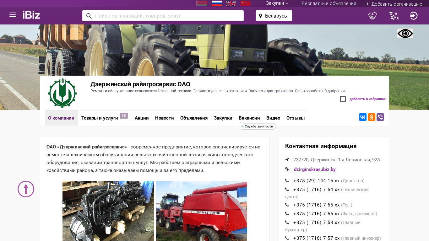 SEO-описаниеДзержинский райагросервис ОАО - Ремонт и обслуживание сельскохозяйственной техники. Запчасти для сельхозтехники. Запчасти для тракторов. Сельхозработы. Удобрения.. Схема проезда, контактные телефоны, адрес компании Дзержинский райагросервис ОАО. 222720, Дзержинск, , 1-я Ленинская, 92А