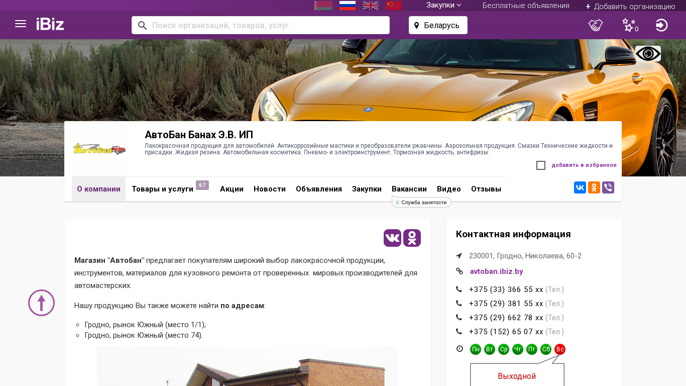 Название / ЗаголовокАвтоБан Банах Э.В. ИП - Лакокрасочная продукция для автомобилей. Антикоррозийные мастики и преобразователи ржавчины. Аэрозольная продукция. Смазки.Технические жидкости и присадки. Жидкая резина. Автомобильная косметика. Пневмо- и электроинструмент. Тормозная жидкость, антифризы.. 230001, Гродно, , Николаева, 60-2
