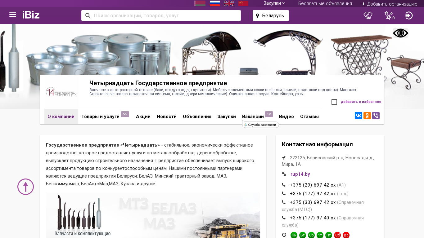 SEO-описание | Четырнадцать Государственное предприятие - Запчасти к автотракторной технике (баки, воздуховоды, глушители). Мебель с элементами ковки (вешалки, качели, подставки под цветы). Мангалы. Строительные товары (водосточная система, гвозди, двери металлические). Оцинкованная посуда. Контейнеры, урны.. Схема проезда, контактные телефоны, адрес компании Четырнадцать Государственное предприятие. 222125, , Новосады д., Мира, 1А |