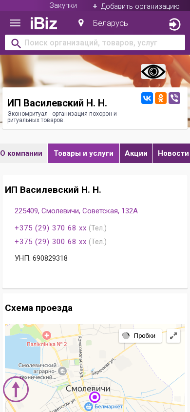 SEO-описание | ИП Василевский Н. Н. - Экономритуал - организация похорон и ритуальных товаров.. Схема проезда, контактные телефоны, адрес компании ИП Василевский Н. Н.. 225409, Смолевичи, , Советская, 132А |