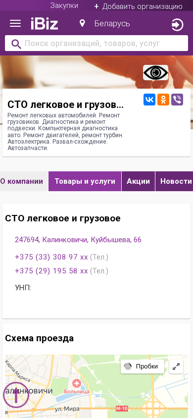 Название / ЗаголовокСТО легковое и грузовое - Ремонт легковых автомобилей. Ремонт грузовиков. Диагностика и ремонт подвески. Компьютерная диагностика авто. Ремонт двигателей, ремонт турбин. Автоэлектрика. Развал-схождение. Автозапчасти.. 247694, Калинковичи, , Куйбышева, 66