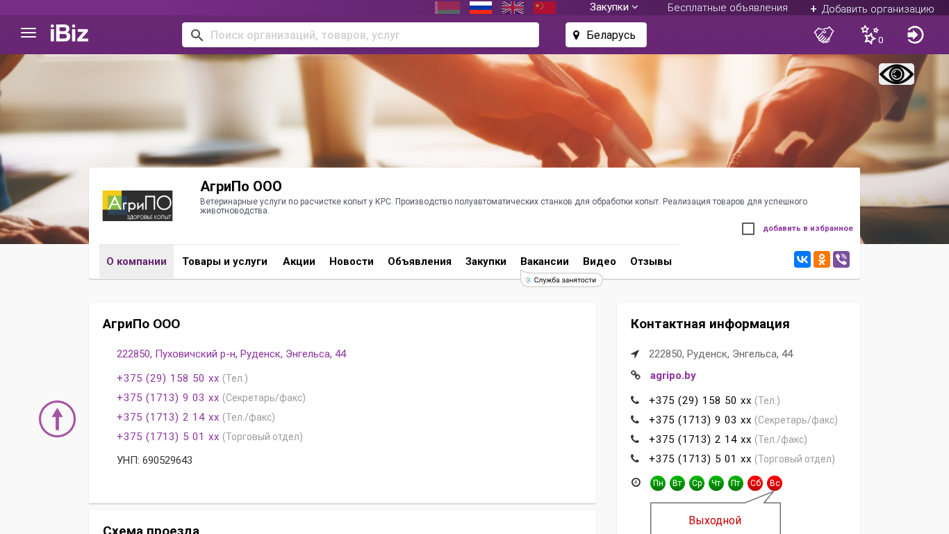 Название / Заголовок | АгриПо ООО - Ветеринарные услуги по расчистке копыт у КРС. Производство полуавтоматических станков для обработки копыт. Реализация товаров для успешного животноводства.. 222850, Руденск, , Энгельса, 44 |