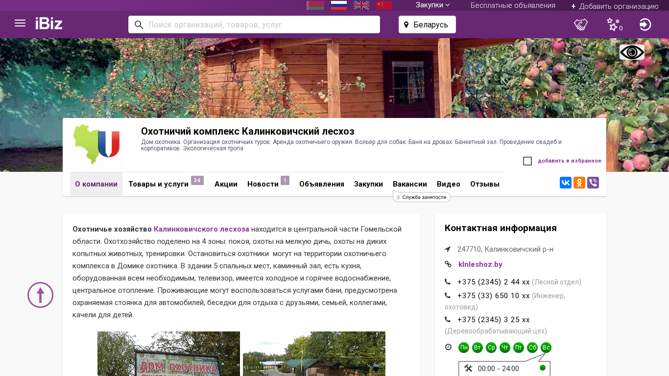 Название / Заголовок | Охотничий комплекс Калинковичский лесхоз - Дом охотника. Организация охотничьих туров. Аренда охотничьего оружия. Вольер для собак. Баня на дровах. Банкетный зал. Проведение свадеб и корпоративов. Экологическая тропа . 247710, |