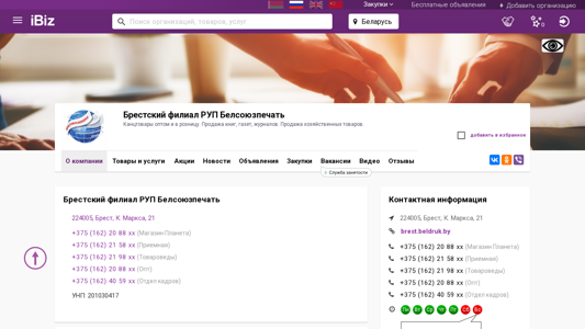 Название / Заголовок | Брестский филиал РУП Белсоюзпечать - Канцтовары оптом и в розницу. Продажа книг, газет, журналов. Продажа хозяйственных товаров.. 224005, Брест, , К. Маркса, 21 |