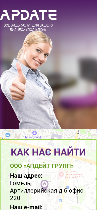 | AI-анализ | The website is an online business services platform offering various services "под ключ" (all-inclusive) for businesses in Belarus. The title of the website is not provided, but it may include the name of the company, "Апдейт ГРУПП" (Apdate Group), and keywords related to business services and contact information. The description mentions various services such as "бухгалтерское сопровождение" (bookkeeping services) and the option to "заказать звонок" (make a call request). The top_words data indicates that the phone numbers 375 (29) 150-80-40 and 375 (29) 150-66-40 are frequently mentioned on the website, likely for contact purposes. The website also includes information about the company's location and |