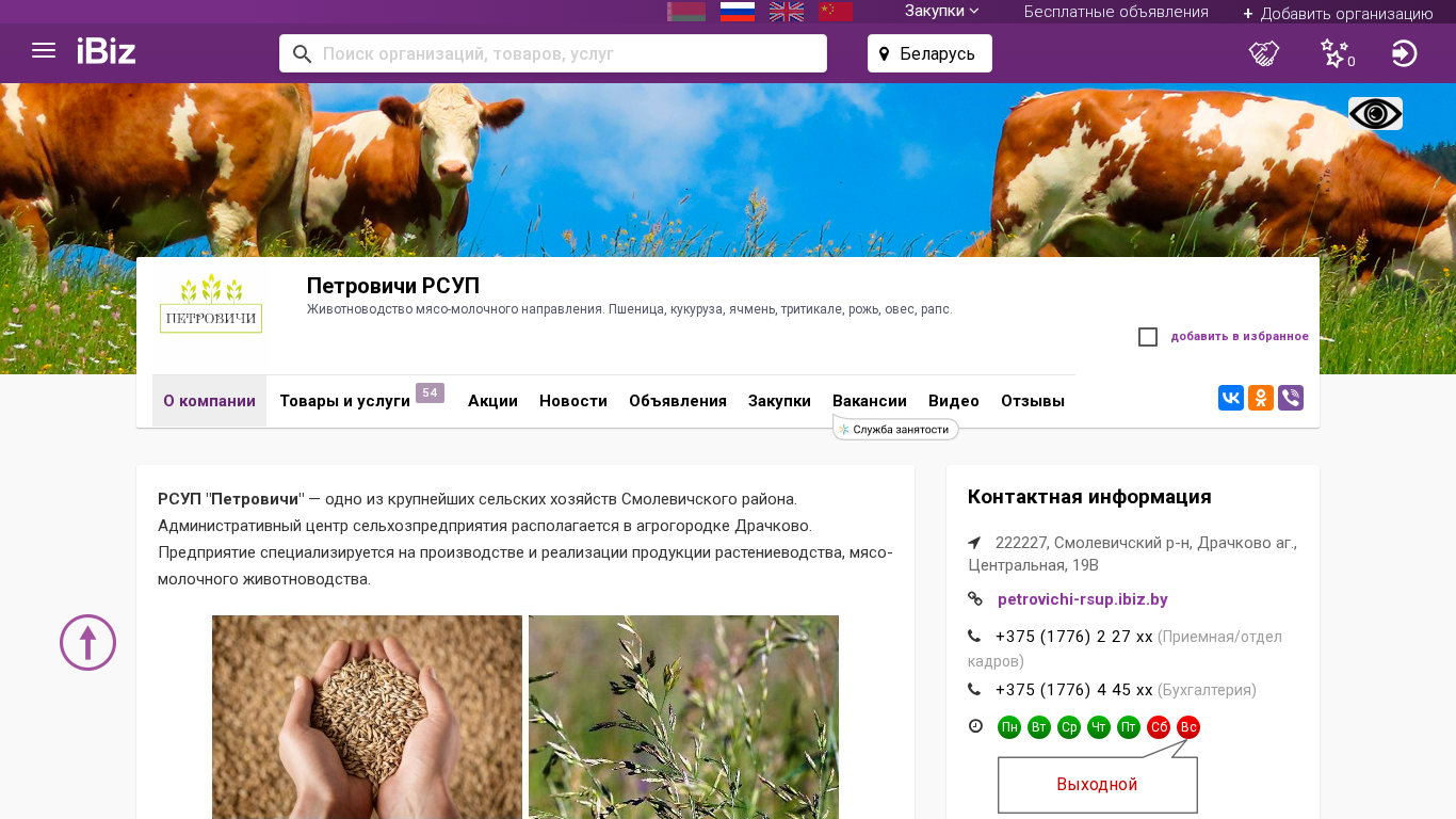 Название / Заголовок | Петровичи РСУП - Животноводство мясо-молочного направления. Пшеница, кукуруза, ячмень, тритикале, рожь, овес, рапс.. 222227, , Драчково аг., Центральная, 19В |