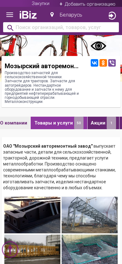 Название / Заголовок | Мозырский авторемонтный завод ОАО - Производство запчастей для сельскохозяйственной техники. Запчасти для тракторов. Запчасти для автогрейдеров. Нестандартное оборудование и запчасти к нему для предприятий нефтеперерабатывающей и горнодобывающей отрасли. Металлоконструкции. . 247760, Мозырь, , Октябрьская, 9 |