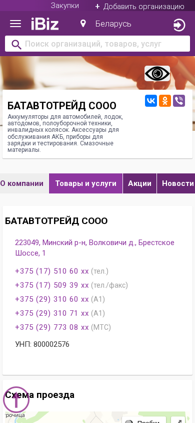 Название / Заголовок | БАТАВТОТРЕЙД СООО - Аккумуляторы для автомобилей, лодок, автодомов, полоуборочной техники, инвалидных колясок. Аксессуары для обслуживания АКБ, приборы для зарядки и тестирования. Смазочные материалы.. 223049, , Волковичи д., Брестское Шоссе, 1 |