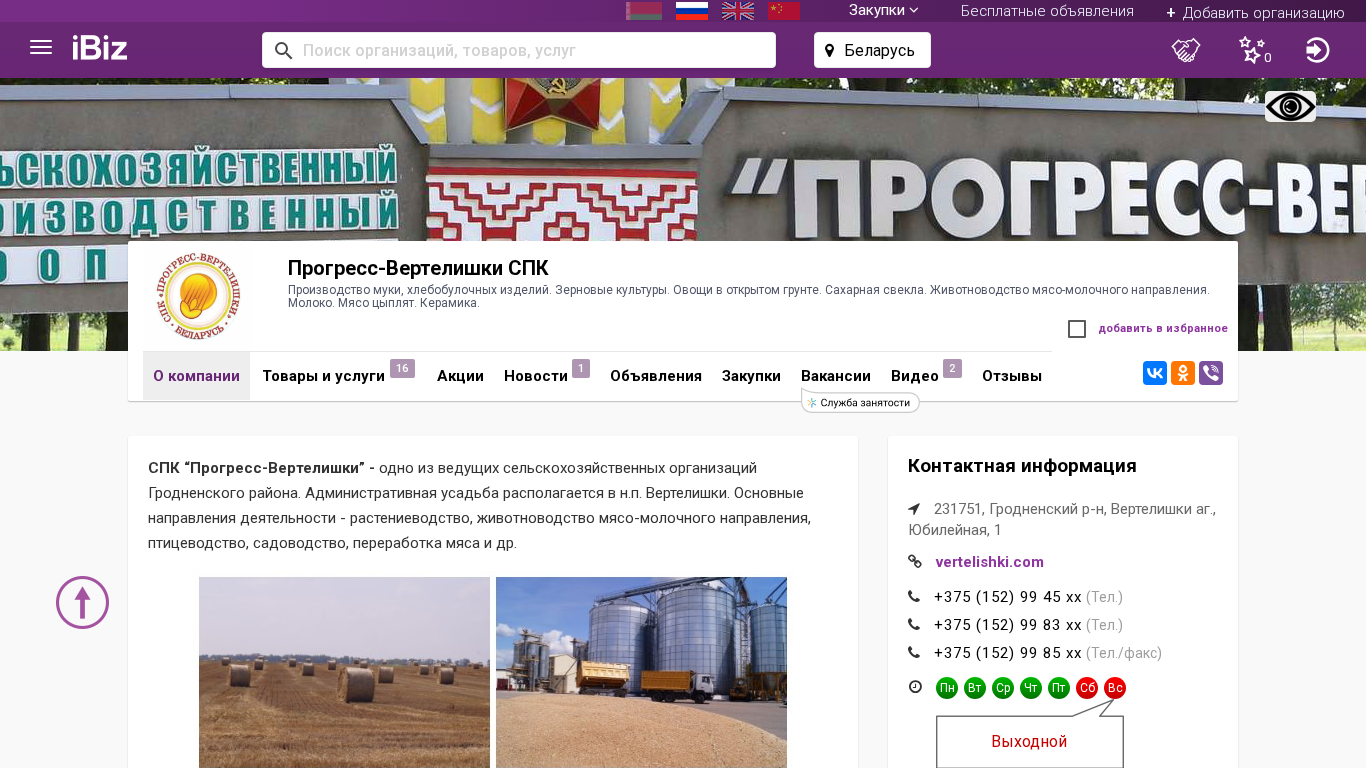 favicon Прогресс-Вертелишки СПК - Производство муки, хлебобулочных изделий. Зерновые культуры. Овощи в открытом грунте. Сахарная свекла. Животноводство мясо-молочного направления. Молоко. Мясо цыплят. Керамика.. 231751, , Вертелишки аг., Юбилейная, 1