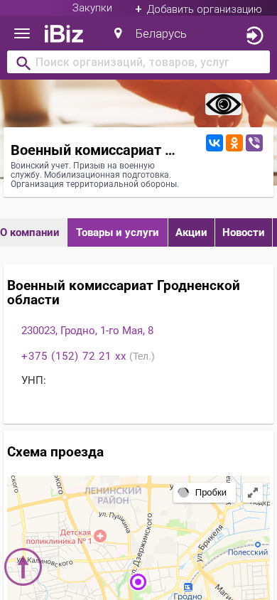 Название / ЗаголовокВоенный комиссариат Гродненской области - Воинский учет. Призыв на военную службу. Мобилизационная подготовка. Организация территориальной обороны.. 230023, Гродно, , 1-го Мая, 8