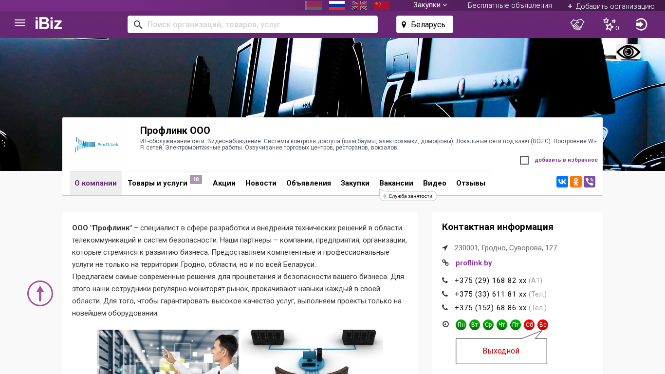 SEO-описание | Профлинк ООО - ИТ-обслуживание сети. Видеонаблюдение. Системы контроля доступа (шлагбаумы, электрозамки, домофоны). Локальные сети под ключ (ВОЛС). Построение Wi-Fi сетей. Электромонтажные работы. Озвучивание торговых центров, ресторанов, вокзалов.. Схема проезда, контактные телефоны, адрес компании Профлинк ООО. 230001, Гродно, , Суворова, 127 |
