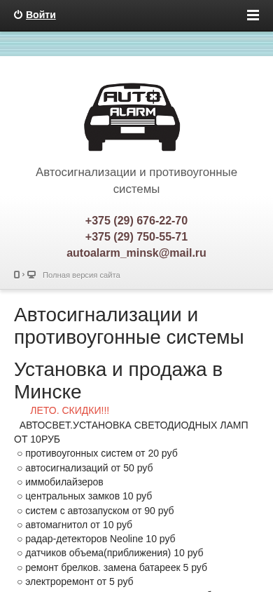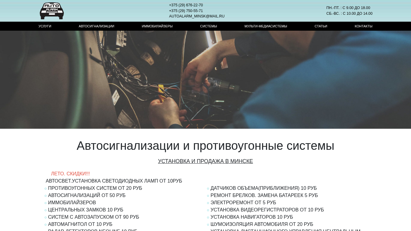 | AI-анализ | This online resource is dedicated to car alarm systems and anti-theft devices in Belarus. The title of the website is 'Автосигнализации и противоугонные системы' which translates to 'Car Alarm Systems and Anti-Theft Devices' in English. The description explains that having a reliable car alarm system can protect a vehicle not only from theft but also from various other unpleasant situations. The website offers a range of alarm systems from Alligator, A.P.S., Pantera, KGB, and Immoilizer, among others. Visitors can find information on the navigation, contacts, and services related to these systems. The website also mentions sales and installations in Minsk, and provides pricing information for various car accessories, including anti-theft systems, central locks, and navigation systems, among others. The website also offers repairs and installation |