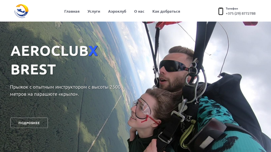 The website Aeroclub Brest offers skydiving services with tandem jumps and solo jumps using 'wing' or 'dome' parachutes from an altitude of 2500 meters. The site also provides flights on planes for personal enjoyment or as gifts. The mission of the aeroclub is to set high standards in aviation sports. The team has experienced instructors with international licenses and a conveniently located airport for easy access. Modern equipment from top manufacturers is used, and a full range of services is provided, including flying lessons for sports parachutists. The team includes experienced professionals such as Remarchuk Elena, Moroz Vladimir, Shindich Alexander, and Shafraнов Alexander. Positive testimonials from clients are featured, praising the instructors and the emotional experience of skydiving.