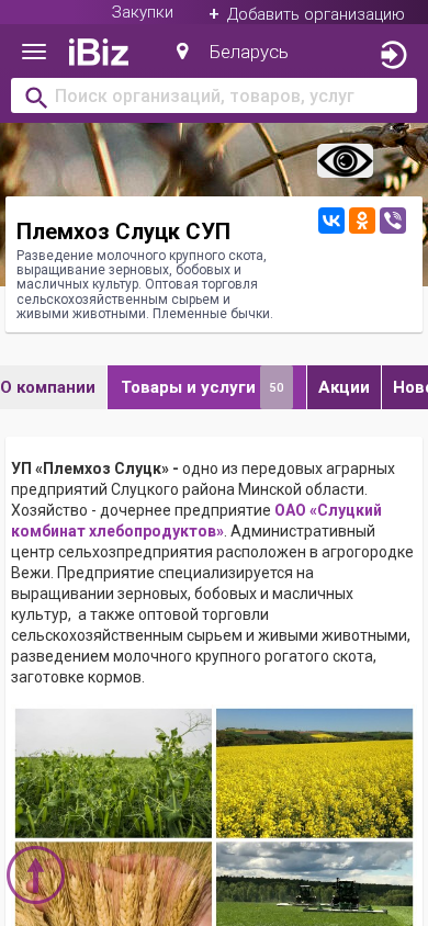 Название / ЗаголовокПлемхоз Слуцк CУП - Разведение молочного крупного скота, выращивание зерновых, бобовых и масличных культур. Оптовая торговля сельскохозяйственным сырьем и живыми животными. Племенные бычки.. 223622, , Вежи аг.