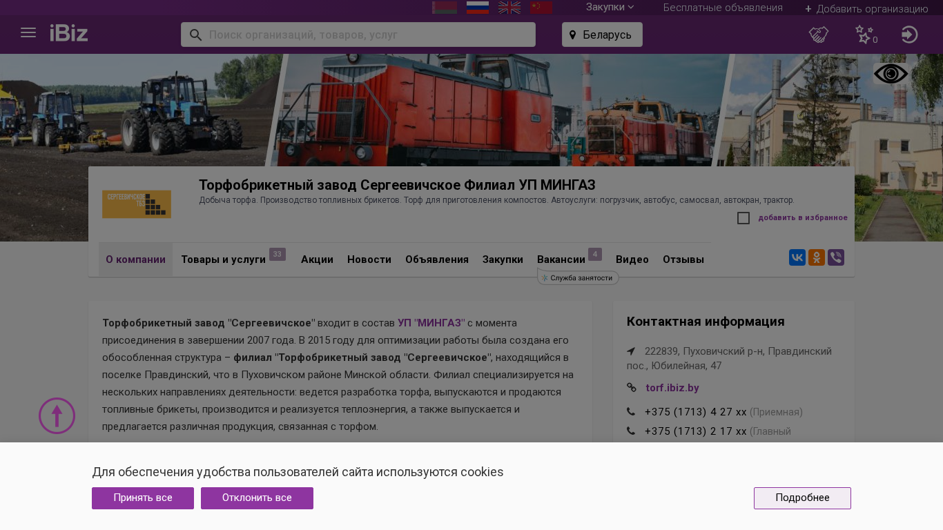 Название / Заголовок | Торфобрикетный завод Сергеевичское Филиал УП МИНГАЗ - Добыча торфа. Производство топливных брикетов. Торф для приготовления компостов. Автоуслуги: погрузчик, автобус, самосвал, автокран, трактор.. 222839, , Правдинский пос., Юбилейная, 47 |