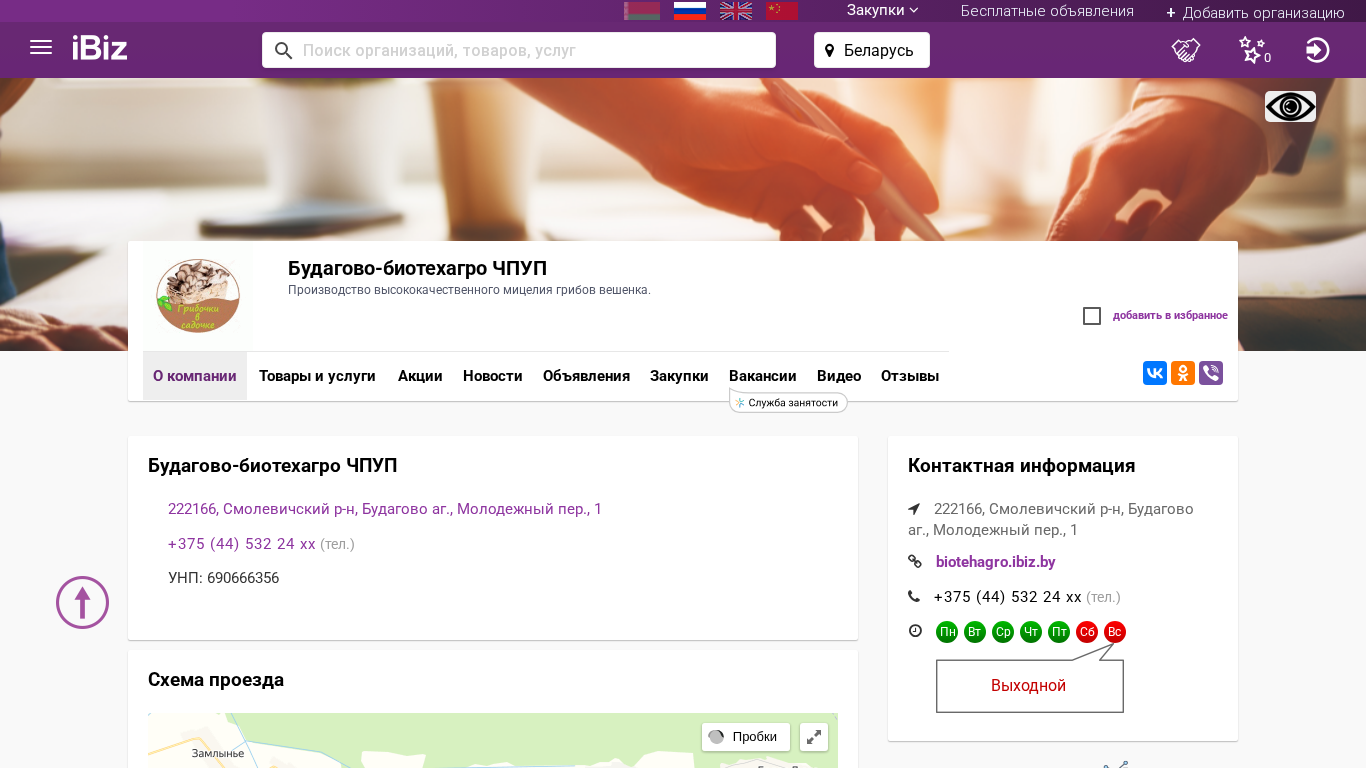 Название / Заголовок | Будагово-биотехагро ЧПУП - Производство высококачественного мицелия грибов вешенка.. 222166, , Будагово аг., Молодежный пер., 1 |