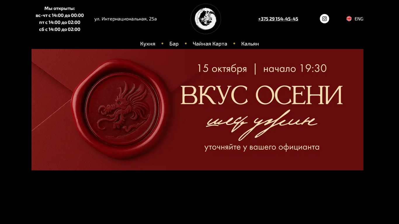 SEO-описание⚫️ Лаунж-бар в центре Минска с паназиатской кухней, кальянами и традиционными чайными церемониями. 📍 Минск, ул. Интернациональная, 25А 📞 +375 29 154 45 45 - бронирование