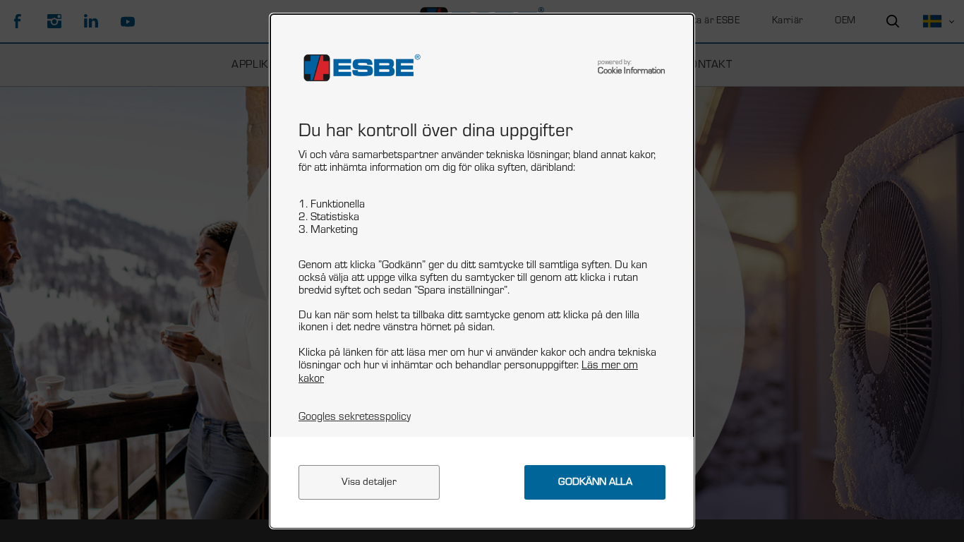 SEO-описаниеESBE erbjuder ett heltäckande sortiment av ställdon, ventiler, shuntgrupper, rumstermostater, Fresh Hydro etc för värme- och kylreglering i vätskeburna system.