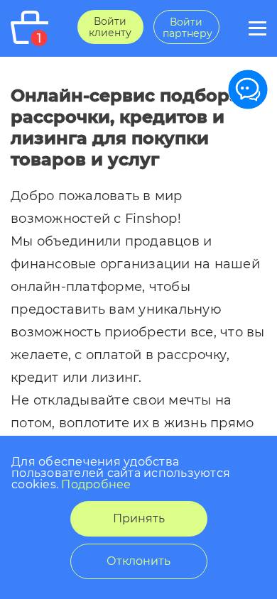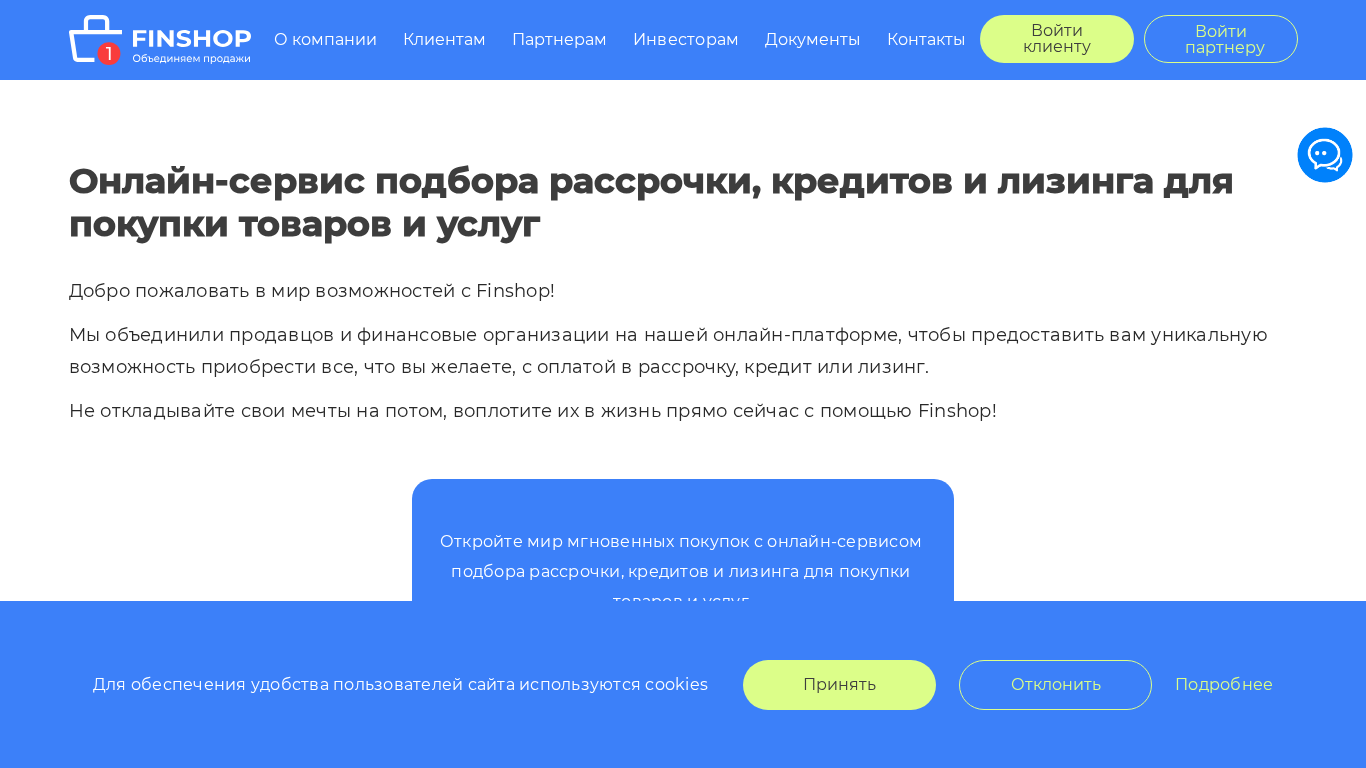 SEO-описание | Finshop - онлайн-сервис для продажи товаров и услуг с помощью кредитных продуктов, предоставляемых сетью банков-партнеров и лизинговых компаний |