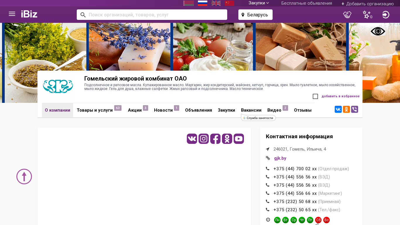 Название / Заголовок | Гомельский жировой комбинат ОАО - Подсолнечное и рапсовое масла. Купажированное масло. Маргарин, жир кондитерский, майонез, кетчуп, горчица, хрен. Мыло туалетное, мыло хозяйственное, мыло жидкое. Гель для душа, влажные салфетки. Жмых рапсовый и подсолнечника. Масло техническое.. 246021, Гомель, , Ильича, 4 |