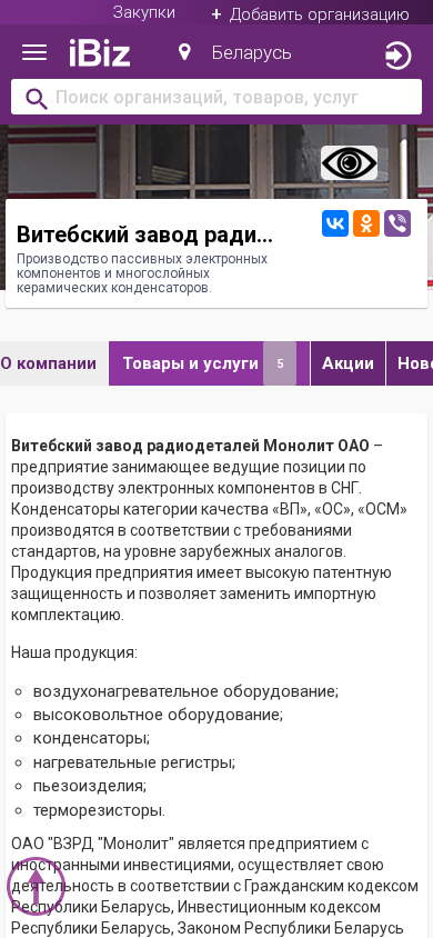 Название / Заголовок | Витебский завод радиодеталей Монолит ОАО - Производство пассивных электронных компонентов и многослойных керамических конденсаторов.. 210101, Витебск, , М. Горького, 145 |
