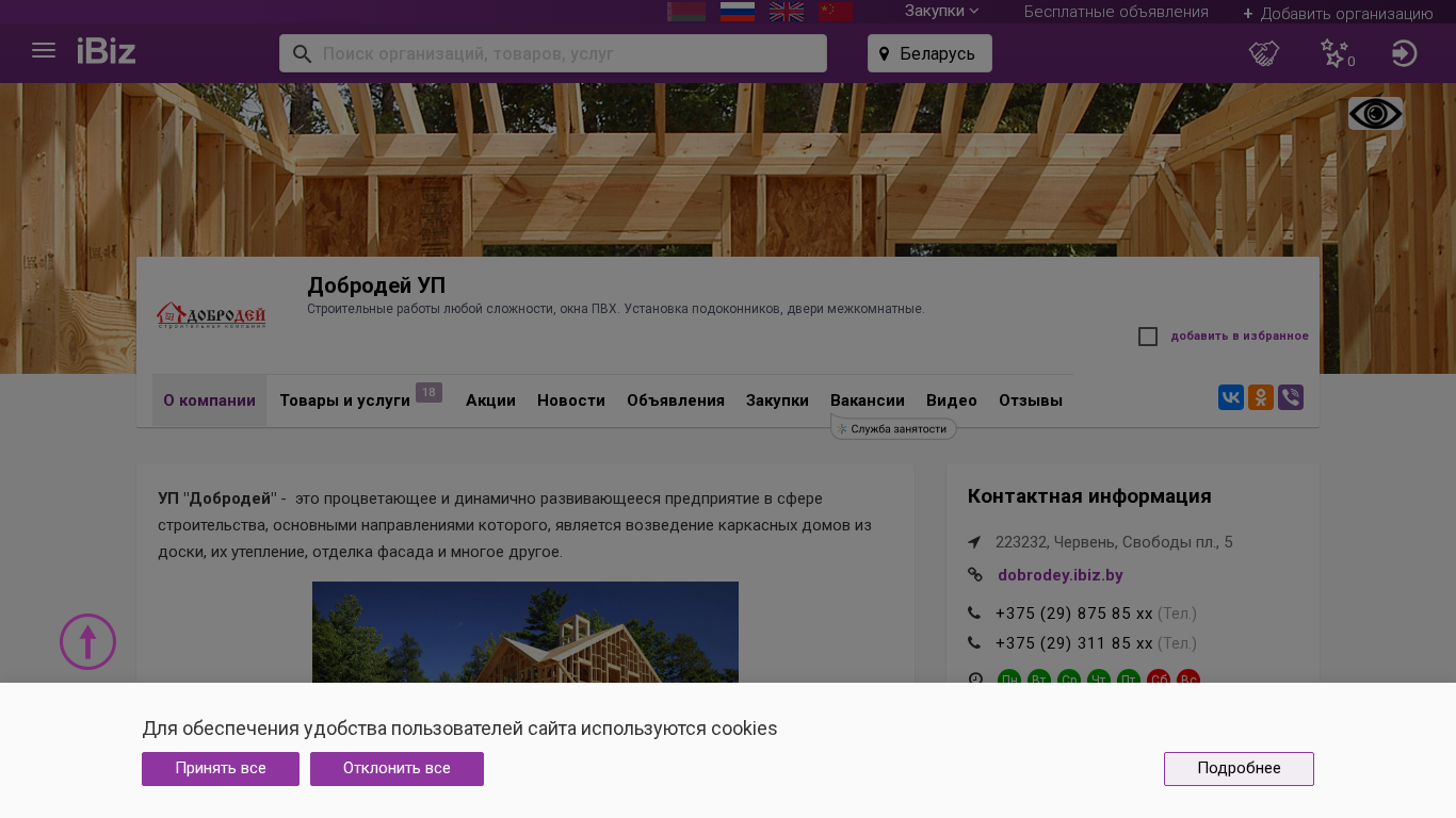 Название / ЗаголовокДобродей УП - Строительные работы любой сложности, окна ПВХ. Установка подоконников, двери межкомнатные.. 223232, Червень, , Свободы пл., 5