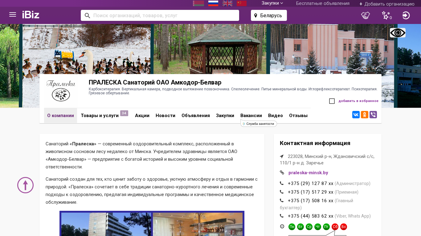 SEO-описание | ПРАЛЕСКА Санаторий ОАО Амкодор-Белвар - Карбокситерапия. Вертикальная камера, подводное вытяжение позвоночника. Спелеолечение. Питье минеральной воды. Иглорефлексотерапевт. Психотерапия. Грязевое обертывание.. Схема проезда, контактные телефоны, адрес компании ПРАЛЕСКА Санаторий ОАО Амкодор-Белвар. 223028, , Ждановичский с/с, 110/1 р-н д. Заречье |