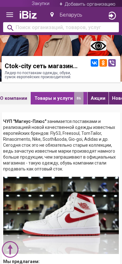 Название / Заголовок | Ctok-city сеть магазинов ЧУП Магнус-Плюс - Лидер по поставкам одежды, обуви, сумок европейских производителей.. 210023, Витебск, , Московский пр-т, 29, кор.2-68 |