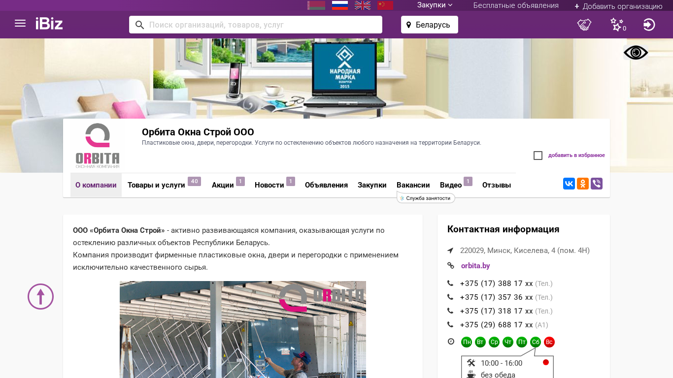 Название / Заголовок | Орбита Окна Строй ООО - Пластиковые окна, двери, перегородки. Услуги по остекленению объектов любого назначения на территории Беларуси.. 220029, Минск, Киселева, 4 (пом. 4Н) |
