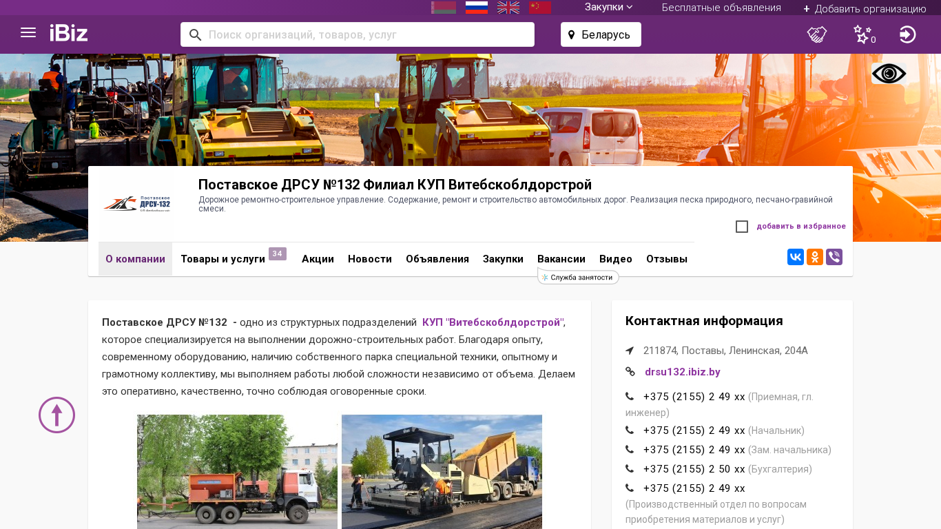 Название / Заголовок | Поставское ДРСУ №132 Филиал КУП Витебскоблдорстрой - Дорожное ремонтно-строительное управление. Содержание, ремонт и строительство автомобильных дорог. Реализация песка природного, песчано-гравийной смеси.. 211874, Поставы, , Ленинская, 204А |
